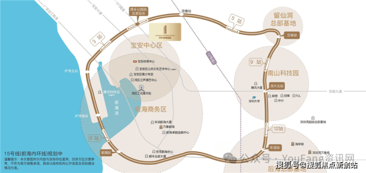 地铁15号线(规划中)作为深圳首条环线轨道,起终点均为前海站,作为战略上的“产业线”,极速串联前海、宝中、大铲湾“腾讯科技岛(在建中)”、南山科技园、后海总部基地、留仙洞总部基地等高端产业密集区,推动资金流、人才流、技术流汇聚,构筑“前海内环”经济大动脉。
