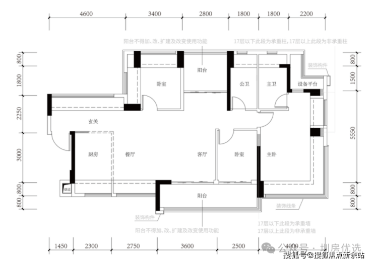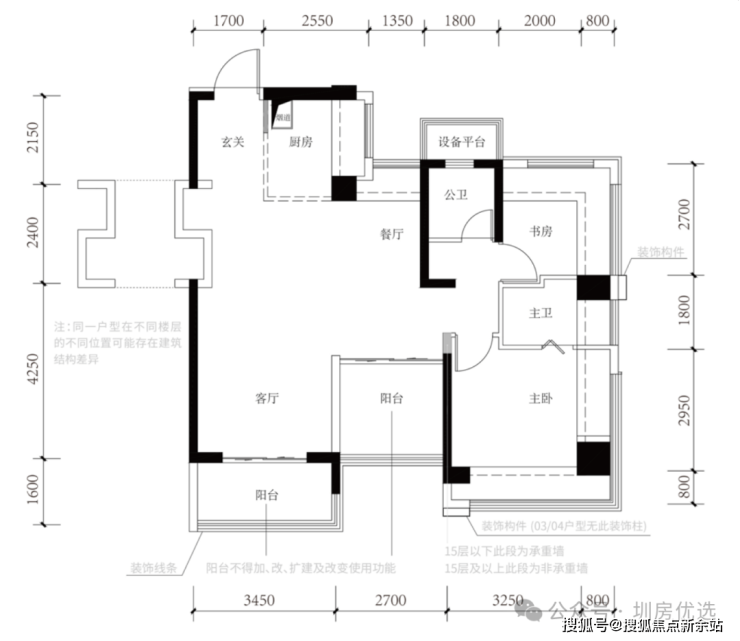 89㎡的4房2厅2卫,设计的是经典竖厅格局,进门入户玄关,客厅3.45米开间,动静分区,三开间朝南,分别做到了主卧14.54㎡/次卧7.96㎡/次卧7.56㎡/次卧5.8m²(包含墙体飘窗),主卧+1个次卧270°飘窗,U型厨房,公卫三段式干湿分离,得房率约102.2%(包含赠送),阳台5.52m²西南或东南朝向。飘窗赠送面积13.17m²+阳台赠送面积6.61m²+设备平台1.8m²=实际赠送面积约21.58m²。