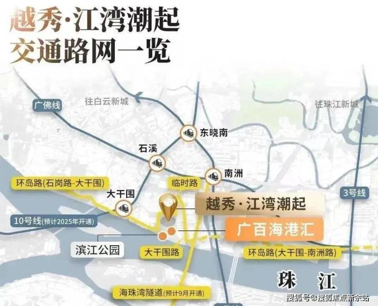 越秀·江湾潮起位于广州海珠创新湾核心区大干围板块,地处粤港澳大湾区中轴,正构建“一区一谷一湾”创新发展新格局,东部以琶洲试验区为龙头,南部以创新湾产业集聚区延伸发展,实现世界数字创新岛的区域想象。
