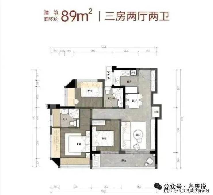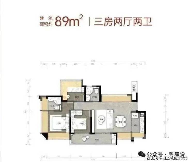 建筑面积约89㎡户型-3房2卫(竖厅)