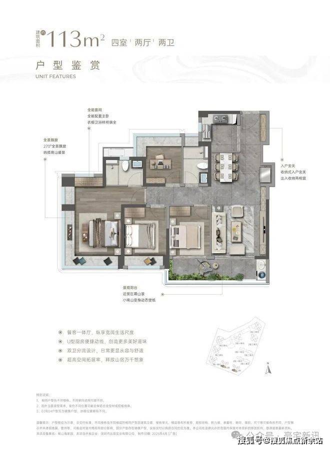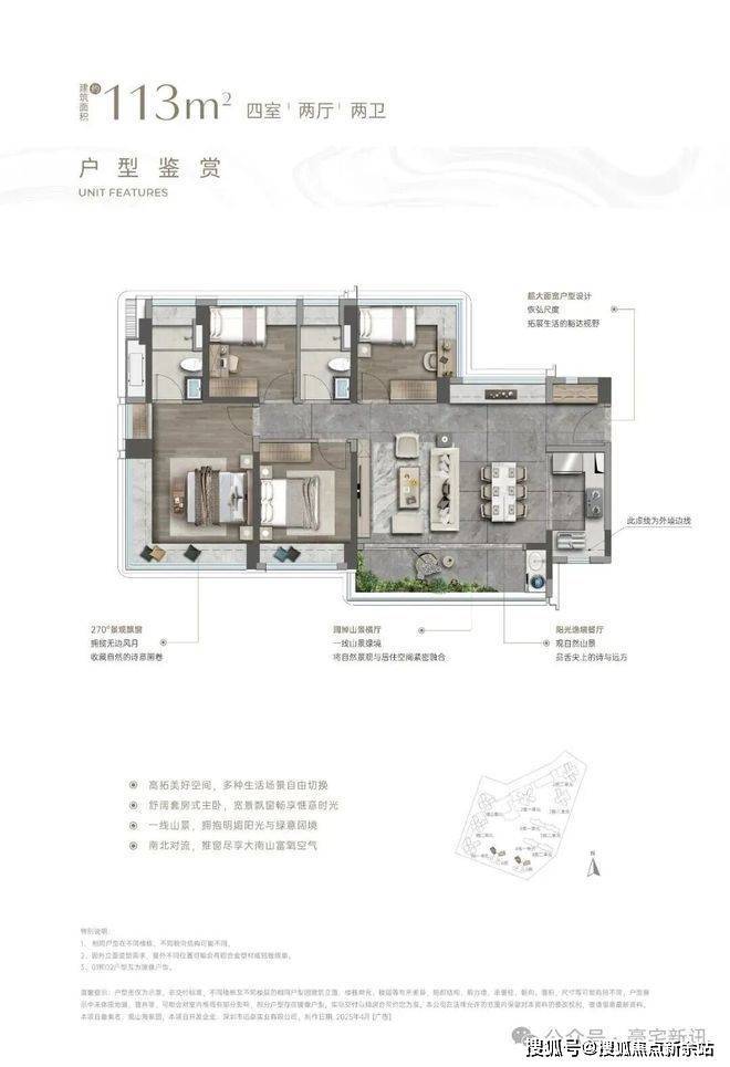 竖庭格局,西南向,基本居住功能与建面约108-110㎡4房2卫一致,但格局不一样,从目前公布的户型图上看,主要是主卧空间有了更大的提升,比如可以放更大一点的衣柜。