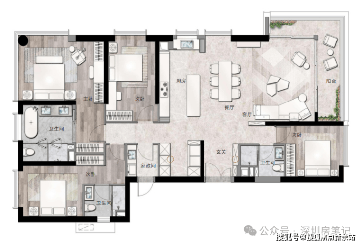 这是终极改善置业的首选。同样97%的得房率,四房三卫设计,完美满足多代同堂需求。