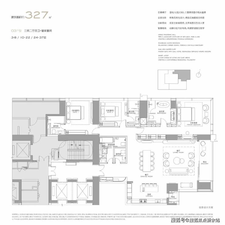 南北通透三面采光,顶奢总统套房规格,270°全景套房,享受湿地/公园/CBD景观,都是套房设计,更具私密性,中西厨分离。