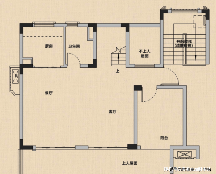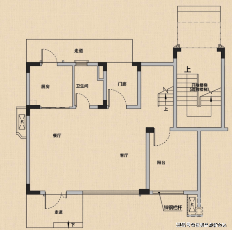 一层:餐客厅一体化设计,开间达约6米、阳台可打通,开间最高可达约10米、客厅挑空设计,尊贵感十足