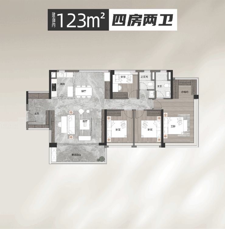 建面约123平四房,卧室都可放下1.8米大床,体验感相当于144平大宅,品质感更高。