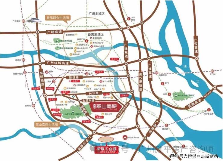 项目位于番禺南边,以大岗为核心,距离市桥南仅半个钟车程,能实现番禺半小时生活圈。往北途径广珠东线能通往番禺,往西途径顺番路能通往佛山顺德,往东途径省道 S111 能通往南 沙金洲,往南途径南沙港快速能通往中山市(一小时车程)。