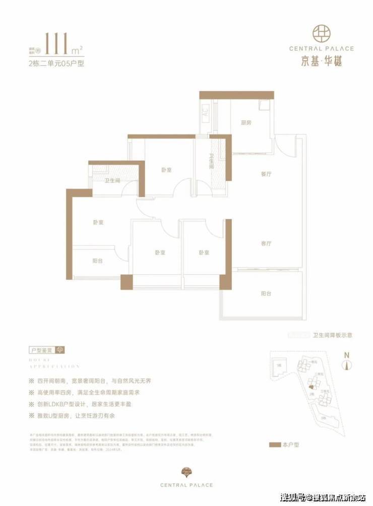 仅2栋2单元05户型才有,设计的是经典竖厅格局,LDKB一体化,动静分区,四开间朝南,U型厨房,卫生间干湿分离,得房率约73%(不含赠送),阳台西南朝向。