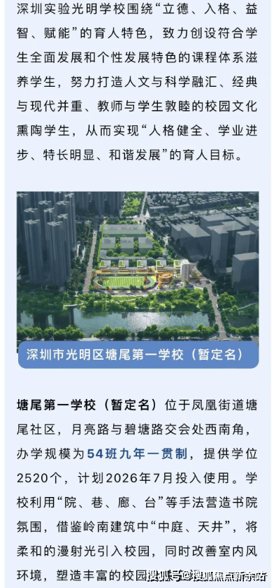 去年官宣:据光明教育局官方公众号发文:新集团+新模式,光明区再添两个基础教育集团,深圳实验学校正式落地在光明凤凰街道塘尾社区,月亮路与碧塘路交会处西南角,办学规模为54班九年一贯制,将大大提升及带动光明的教育质量及水平,同时还在深中学区范围,即双名校加持(最终学区划分以当年教育局政策为准)