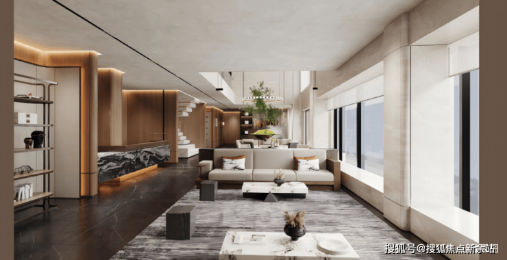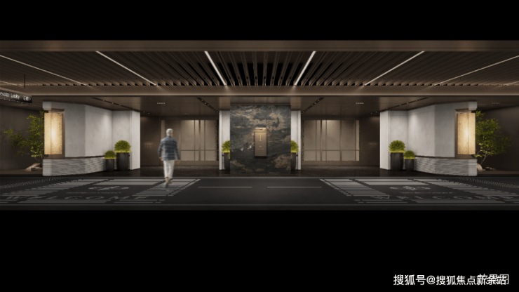 🔘星级车库:车库双大堂设计,大面积采用天然浅色石材,并于天然奢石加以点缀,光厅顶面采用金属构件,结合灯带,增加层次感,彰显项目高定品质。