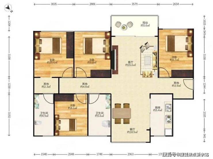 ◆功能分区明确、布局紧凑的四室两卫住宅。从布局来看,户型实现了较好的动静分离:动区(客厅约15.6m²、餐厅约9.8m²、厨房约5.4m²)集中在一侧,静区(主卧约10.6m²、两次卧分别约9.8m²和8.1m²、书房约7.5m²)分布在另一侧。双卫浴设计(约5.6m²和约4.9m²)提升了使用便利性,阳台(约5.6m²)与客厅相连保证了采光通风。各空间面积标注清晰,整体动线流畅,空间利用率较高。