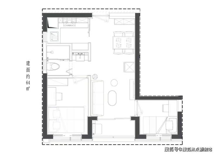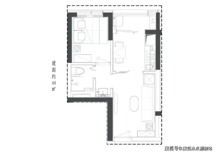目前在售的商务公寓户型包括44㎡的1房、53-56㎡的1房以及63-65㎡和71㎡的2房2厅1卫。