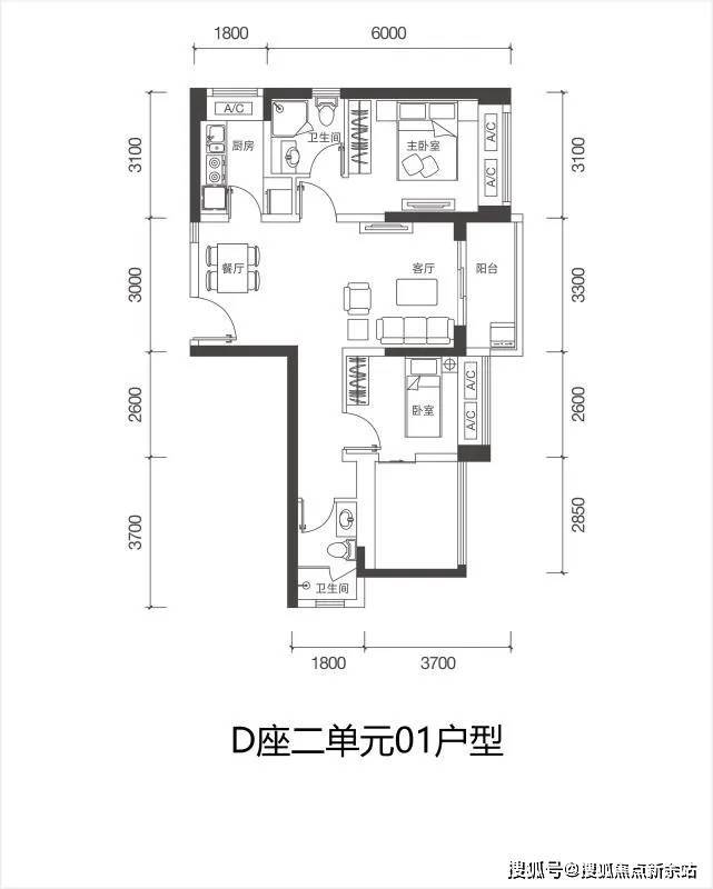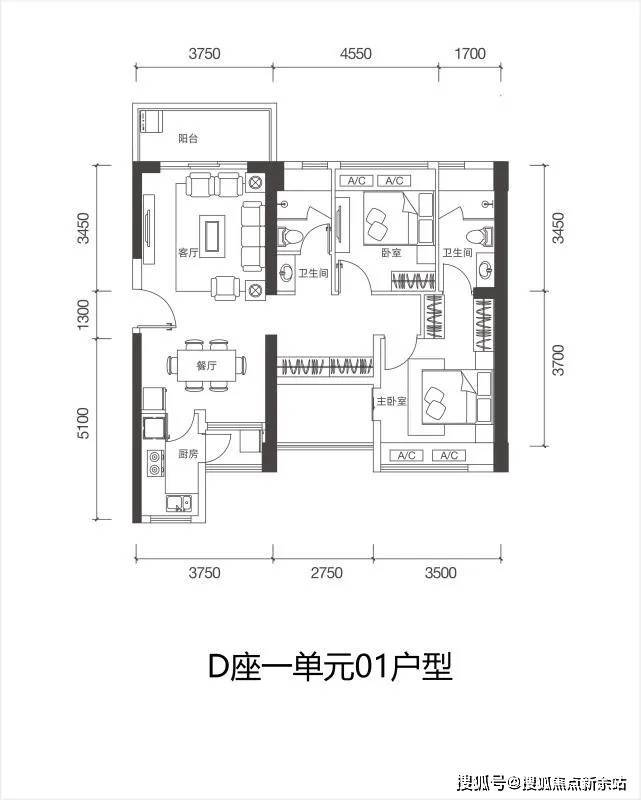 D栋一单元02户型:88㎡ 3房2厅1卫