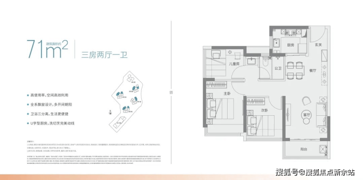 ,设计的是竖厅格局,餐客厅一体化,动静分区,客厅3.2米开间,3个卧室分别做到了主卧13.3㎡/次卧7.83㎡/次卧6.9㎡(包含墙体飘窗),U型厨房,公卫三段式分离设计,得房率78.19%(不含赠送),阳台进深1.25米,有东南、正南或东北向。套内面积63.57㎡+赠送6.8㎡=实用70.37㎡,实际得房率86.56%。