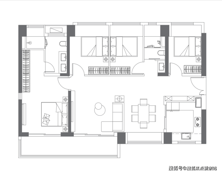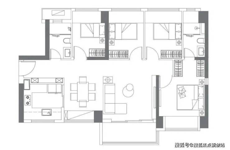 户型做了4房2厅2卫,为横厅设计,一体化公区布局,在厨房炒菜也能和在餐厅、客厅的家人交流、互动,或听孩子分享学校乐事,或和爸妈分享社会趣闻、和另一半聊聊周末计划。