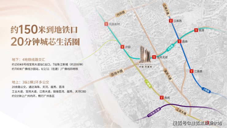 项目距离8号线宝岗大道地铁C出口仅200米,步行几分钟即达,是个妥妥的地铁盘,乘坐8号线,无论是去往老荔湾还算琶洲都非常方便,项目距离广佛线沙园站也才800米,步行大概14分钟左右,算的上是个双地铁楼盘