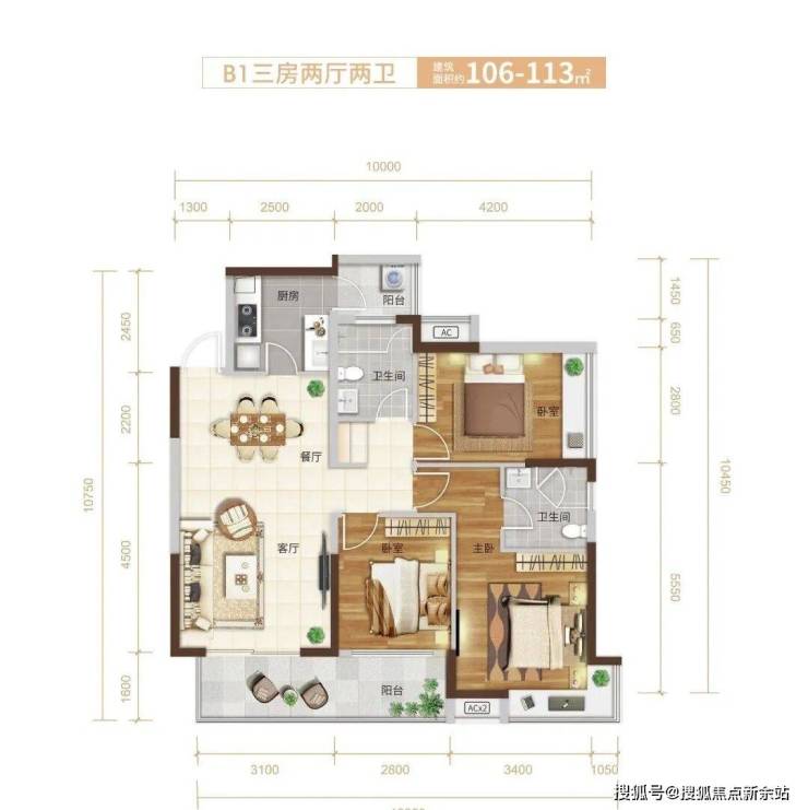 在售户型:A1户型:83-88㎡两房一厅一卫