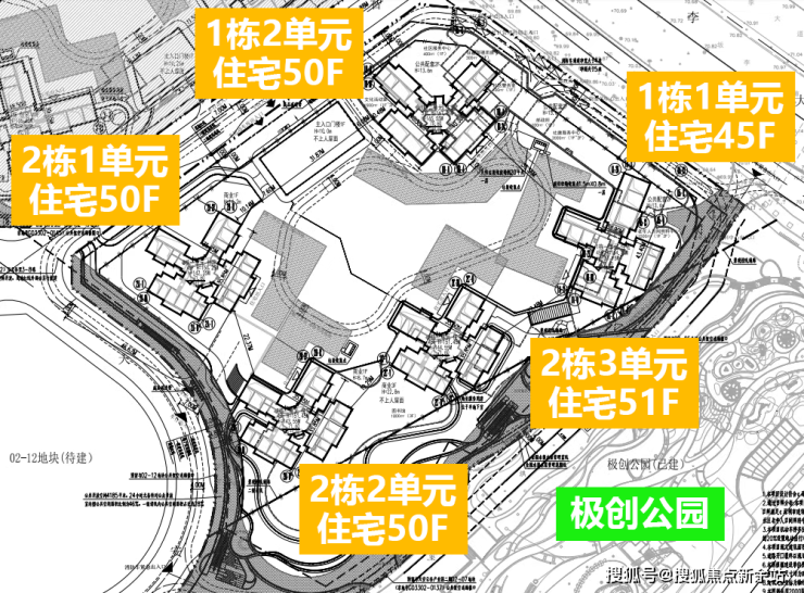 本次首推的天安1号,也就是2-01地块,由天安集团打造,总占地面积约2.5万㎡,总建筑面积约24.44万㎡,计容建筑面积约17.51万㎡,容积率6.32,绿化率40%,共由5栋45-51层高住宅组成,其中1栋1单元住宅45F,1栋2单元住宅50F,2栋1单元住宅51F,2栋2/3单元住宅50F。
