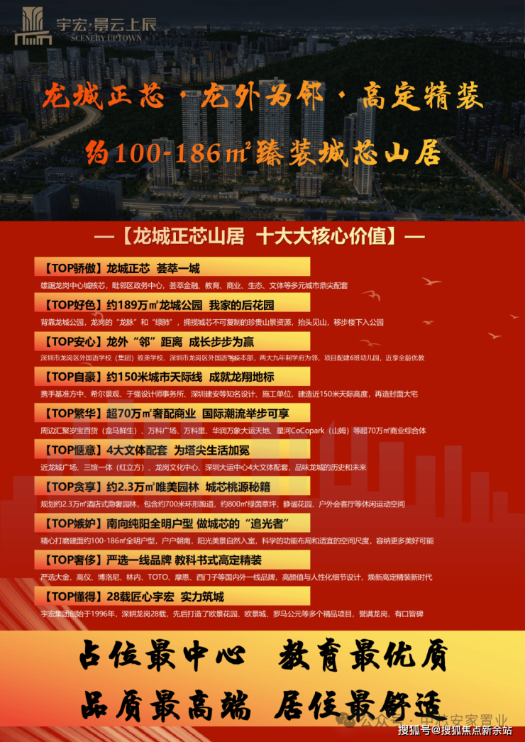 宇宏·景云上辰雄踞龙岗中心城正中核芯,毗邻区府政务中心。荟萃金融、教育、商业、生态、文体等多元城市顶尖配套,享永不落幕的发展红利。