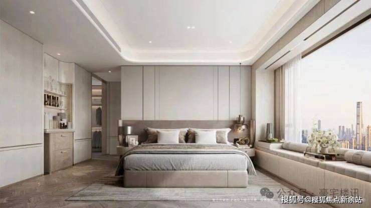 主卧的“私密岛境”:真正的“奢享”,在于绝对的私密与宁静。南向套房与约270°转角飘窗,让主人即使在最私密的休憩时刻,也能独享一片无垠的海天。步入式衣帽间与独立卫浴系统构成的完整闭环,则将效率、尊崇与宁静完美统一,构筑一个身心得以彻底松绑的绝对领地。