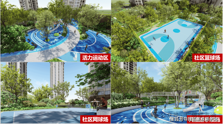 规划有健康跑道、阳光草坪、篮球场、网球场、儿童游乐设施、文化活动室、居民健身设施、星光老年之家、社区服务中心、物业管理用房、社区居委会、健身馆/阅读馆/亲子馆/养生馆/国粹馆主题架空层。