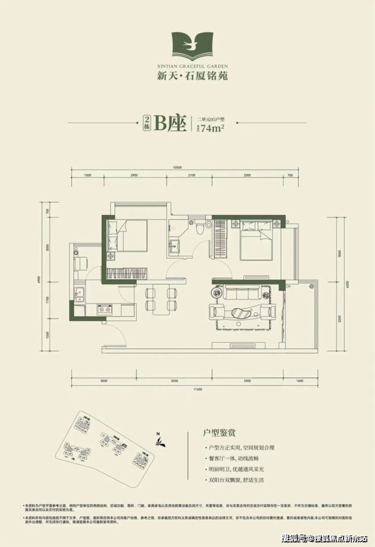 2栋B座二单元04、05户型:面积约为72-74㎡的2房2厅1卫