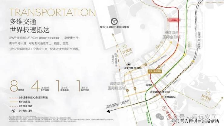 步行550米达5号线妈湾站,3站换乘通达福田/南山;规划15/21/27号线,深珠城际建成后25分钟到香港西九龙。自驾15分钟到科技园,20分钟达福田,妈湾跨海隧道通车,跨区通勤便捷。