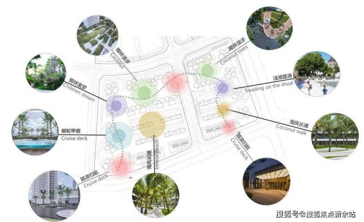 从“ 一线两轴五核”的顶层设计出发,通过一条椰风海岸线延展生活度假、滨海公园轴,并定制5大核心功能区,还原5大滨海场景。