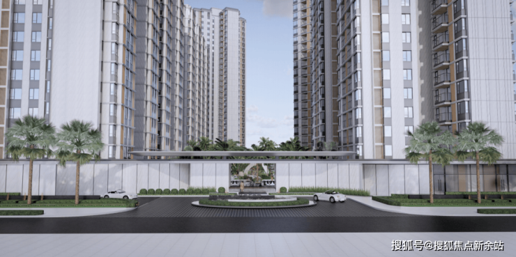 设计师从海南精选270棵椰树,通过固定的弧度和造型形成树影夹道的效果。椰林与香槟色的建筑立面相互辉映,建筑与景观共生交融。