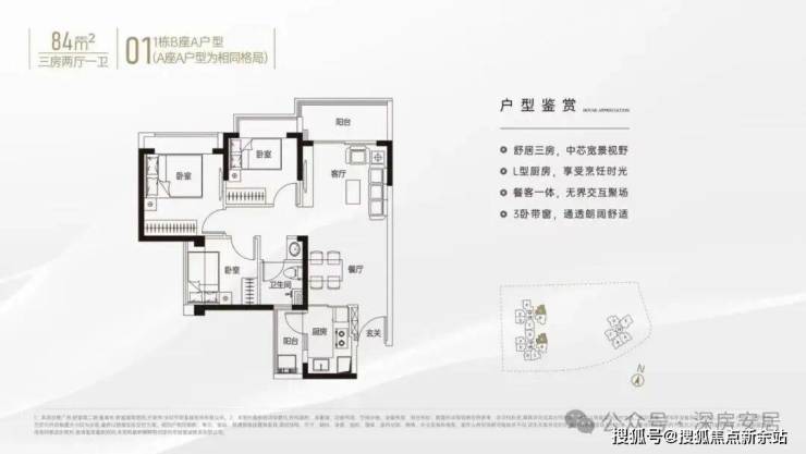 84㎡的3房2厅1卫,A户型,设计的是经典竖厅格局,客厅3.4米开间,LDKB一体化设计,动静分区,L型厨房还带1个生活阳台,卫生间三段式干湿分离,得房率约79%(不含赠送),东北朝向。