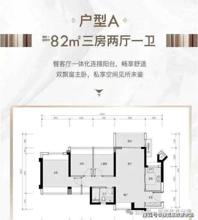 82㎡的3房2厅1卫(户型A),1栋/3栋1单元的05户型,设计的是竖厅南北通透格局,进门入户玄关,客厅3.3米开间,LDKB一体化设计,3个卧室分别做到了3米/2.55米/2.35米的宽度,主卧双飘窗南北通设计,U型厨房,得房率:77.51%(不含赠送),阳台主朝东北向。