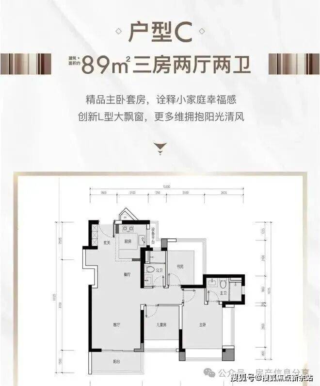 89㎡的3房2厅1卫(户型C),设计的是经典竖厅格局,进门入户玄关,客厅3.5米开间,LDKB一体化设计,动静分区,3个卧室分别做到了3.5米/2.6米/2.55米的宽度,主卧加1个次卧270°飘窗设计,U型厨房,得房率:77.51%(不含赠送),东南、西南或西北朝向。