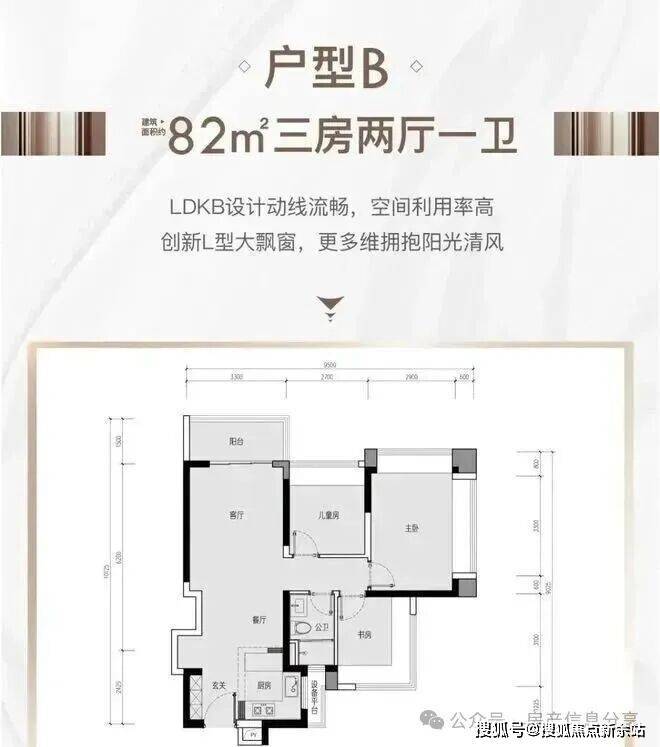82㎡的3房2厅1卫(户型B),设计的是经典竖厅格局,进门入户玄关,客厅3.3米开间,LDKB一体化设计,动静分区,3个卧室分别做到了3.5米/2.7米/2.55米的宽度,主卧加1个次卧270°飘窗设计,U型厨房,得房率:77.5%(不含赠送),全部东北朝向。