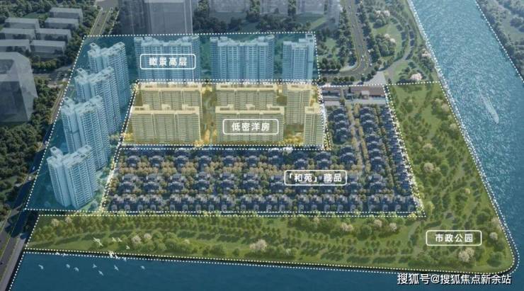 项目由7栋高层住宅、6栋洋房和低密度合院组成,向270°滨河景观开放,层层递进,形成前低后高、玉带环腰的风水格局,保证每户的良好采光和景观朝向。