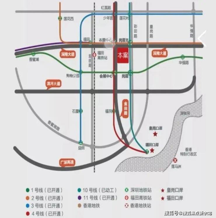 【中心效率】双枢纽双口岸 深港头排畅联世界无缝接驳“五线换乘”岗厦北综合超级枢纽, 2公里内即达全国最大陆路口岸福田口岸及皇岗口岸 由亚洲最大地下高铁站——福田高铁站乘坐高铁,仅需14分钟直达香港西九龙2大综合交通枢纽(福田高铁站、岗厦北交通枢纽)2大超级口岸(福田口岸、皇岗口岸)2条城市东西干道(深南大道和滨河大道)+8条地铁线项目周边汇聚了8条地铁线路,4个站点,其中离1&9号线岗厦站约200米,离4&8号线市民中心站约484米。8条地铁线,1号线罗湖-机场、2号线莲塘-赤湾、3号线福保-双龙、4号线福田口岸-牛湖、7号线西丽湖-太安、10号线福田口岸-双拥街