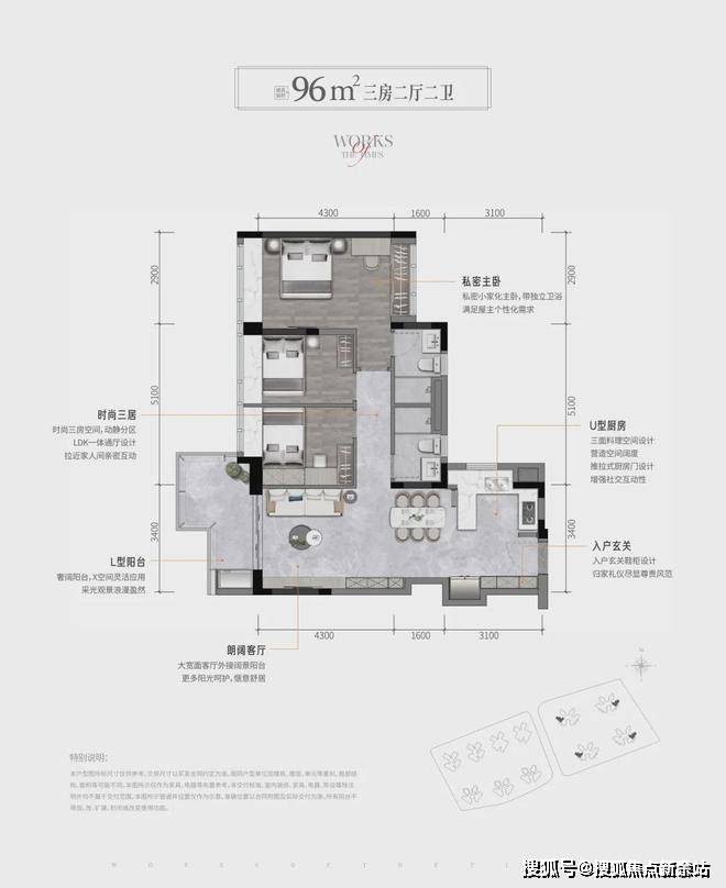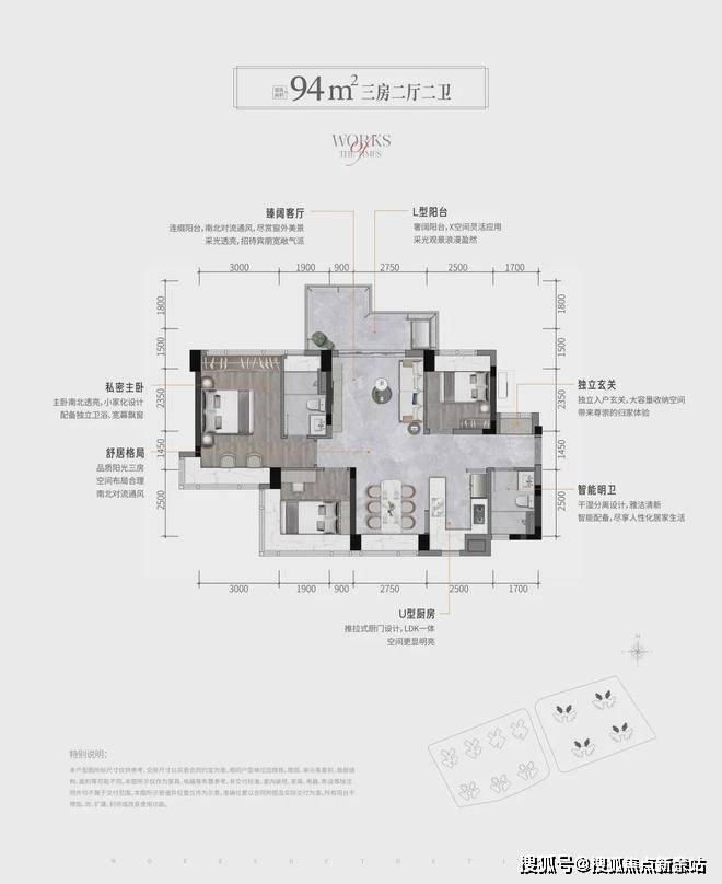 建面约94㎡的三房两厅两卫的产品共有两种户型。