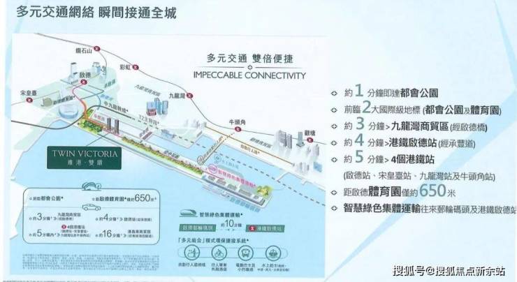景观方面:楼盘位处原机场跑道后排,前临 维多利亚港内海及启德都会公园,兼享启德体育园景观。