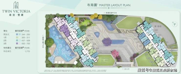 户型:项目提供702伙分层住宅。单位的实用面积介乎约244至1,770平方呎,楼底高度由3.075至3.9米,间隔涵盖开放式至四房,当中包括开放式、1房2厅、2房2厅、3房2厅、4房2厅等四种,分别采用开放式或独立式厨房设计。 户户配置露台及工作平台。