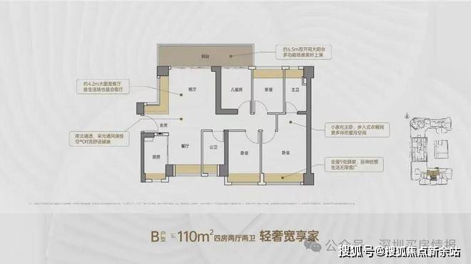 110㎡的4房2厅2卫,设计的是竖厅南北通透格局,客厅4.2米开间,进门户玄关,客厅连接次卧出6.5米长的大阳台,主卧大套间设计,全屋9处飘窗,U型厨房,卫生间干湿分离,阳台主朝北向。