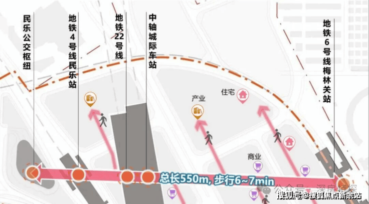 项目紧邻地铁4号线、6号线民乐站,步行约5分钟可达,一站距离直达福田上梅林。未来2028年通车的地铁22号线(在建)将在民乐站实现三线换乘,形成便捷高效的轨道交通网络。民乐站公交接驳线路丰富,包括M302、M342、M391、81路等数十条线路,满足不同出行需求。
