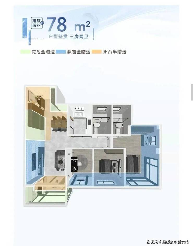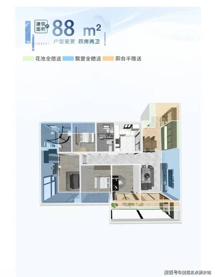 88平四房,不仅做到四房,还实现了四空间两卫双开配景观阳台。• 同等面积多一房,叫板周边一众新盘
