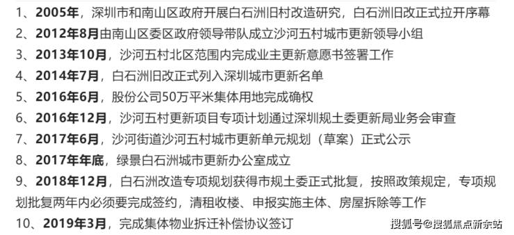 沙河五村城市更新项目(即白石洲旧改)更新单元用地面积约48.01万㎡,拆除用地面积约45.95万㎡,开发建面约30.38万㎡,改造后计容积率总建面高达347.96万㎡,其中住宅125万㎡,商业、办公及旅馆业104.5万㎡,商务公寓112万㎡,公共配套设施6.5万㎡,容积率11.5。