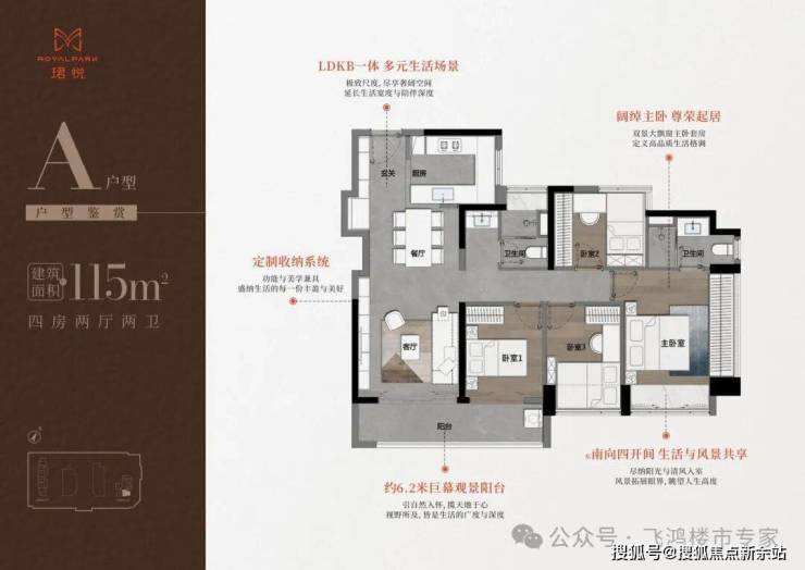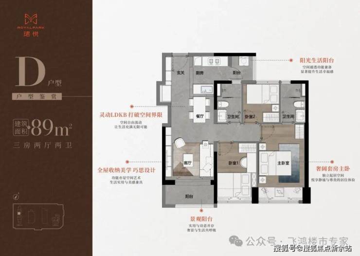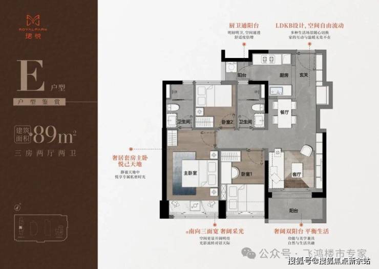 设计的是经典竖厅格局,进门入户玄关,LDKB一体化,S墙设计预留冰箱卡槽位,四开间朝南,动静分区,主卧双面飘窗,客厅连接次卧出6.2米长的巨幕大阳台,U型厨房,公卫三段式分离,得房率76.77%(不含赠送),套内面积88.71㎡,东南朝向,靓点是2个最小的次卧都不用睡飘窗。户型