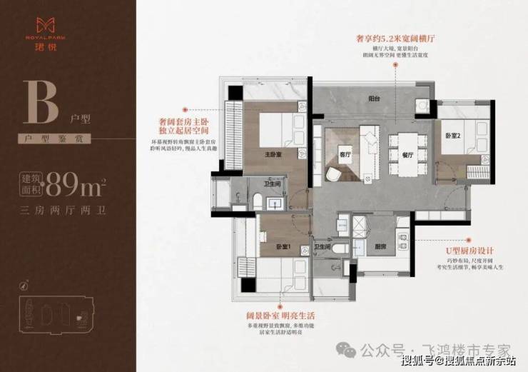 设计的是横厅南北通透格局,进门入户玄关,客餐厅5.2米开间,LDKB一体化,S墙设计预留冰箱卡槽位,三开间朝南,主卧+1个次卧双面大飘窗,客餐厅出5.2米宽景阳台,U型厨房,公卫三段式分离,得房率76.77%(不含赠送),套内面积68.95㎡,阳台主朝西北向。户型