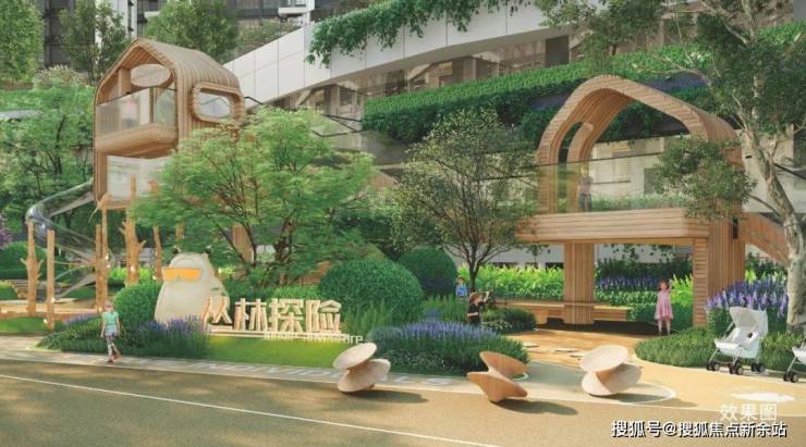 设置瞭望塔、树屋、攀岩墙等分龄段游戏区,高绿量的户外亲子互动场地。
