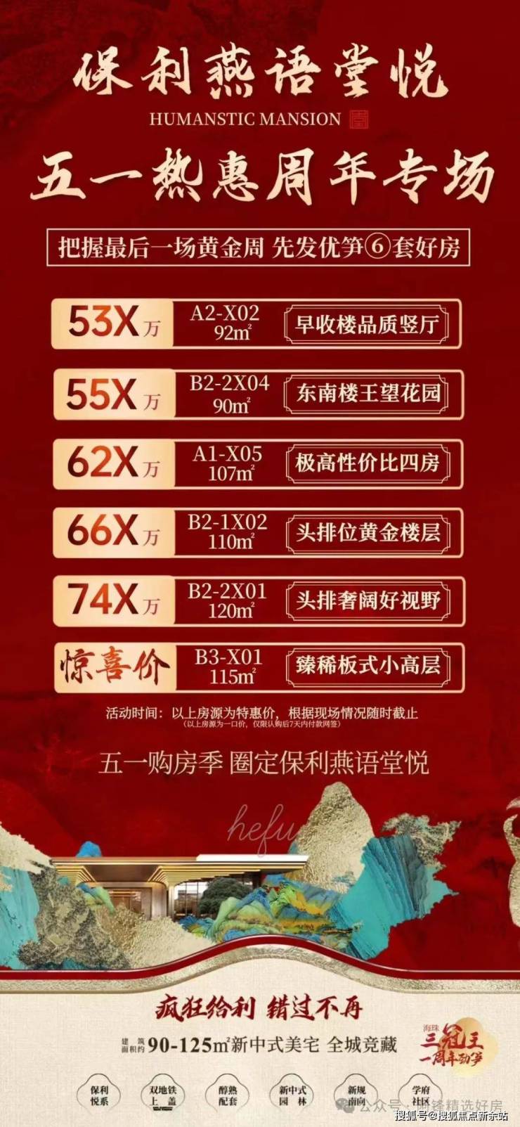 90㎡为高实用横厅三房东南向,享中心园景,近地铁,总价约520~555万;110㎡是已经断货了的热门户型,单边位小四房,置换必抢户型,总价约650~680万;约120-125㎡四房,靓楼层最后5套,总价约750~800万。