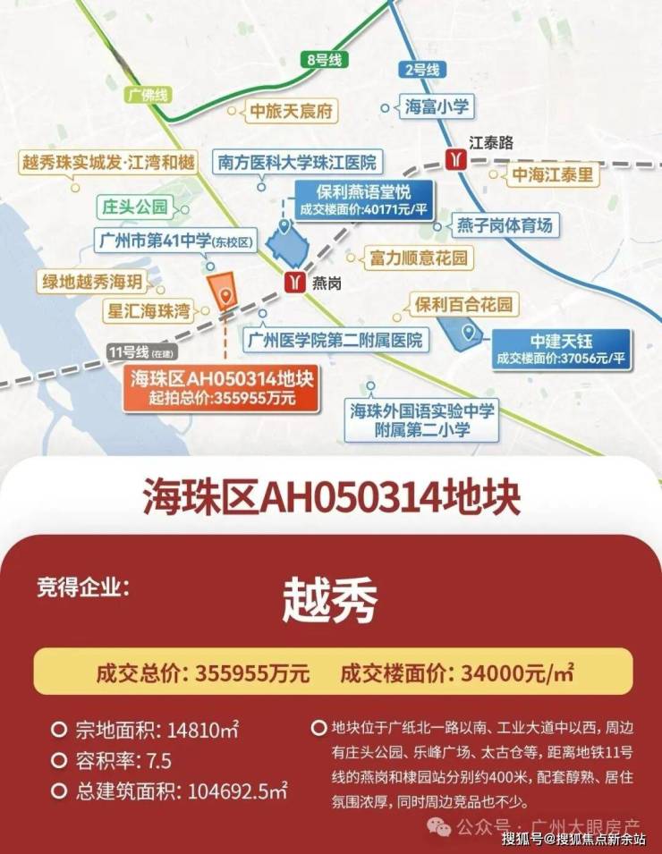 广纸314地块在2024年9月19日出让,越秀以楼面价3.4万/㎡、总价35.6亿元拿下,该地块体量不大,占地面积14810㎡,出让面积13959㎡,总建面约104693㎡。