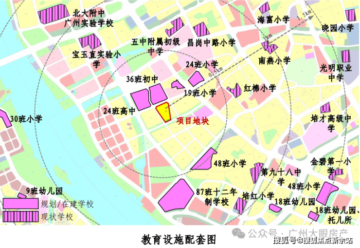 项目自身没有配建学校,但周边名校环伺,3km直线范围内包含广州市五中附属初级中学(省级)、广州市第41中学(省级)、宝玉直实验小学(光大校区)、江南外国语学校、工业大道中小学、红棉小学、海富小学、南燕小学、培红小学等9所学校环伺,拥有完善的区域教育体系。