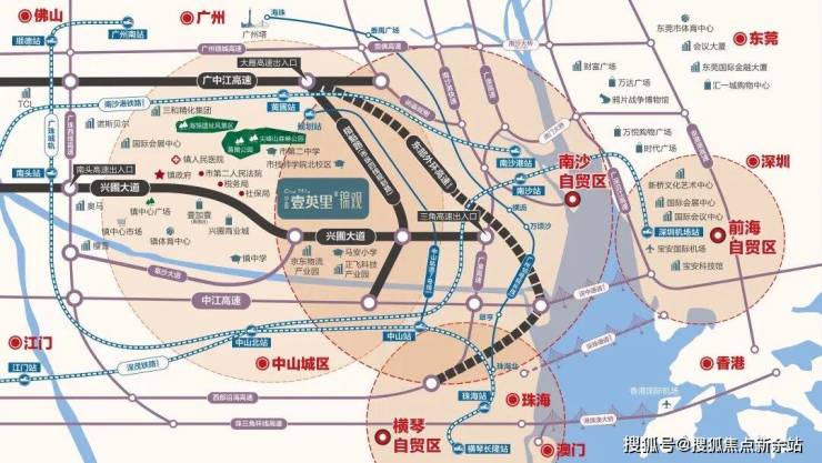 三高速指,沿着兴圃大道往北10分钟到南头高速口,通过广珠西线高速30分钟到广州市区,目前1小时到东莞,1.5小时到深圳(路线:广珠西线——广州绕城高速——虎门大桥),沿着兴圃大道往南10分钟到广澳高速口,30分钟到广州市区,40分钟到东莞,约1小时到深圳(路线:广澳高速——虎门大桥);未来随着广中江高速和东部外环高速的建设,20分钟到东莞,40分钟到深圳;通过纵四线快速接广中江大雁高速口,20分钟到广州,50分钟到深圳。