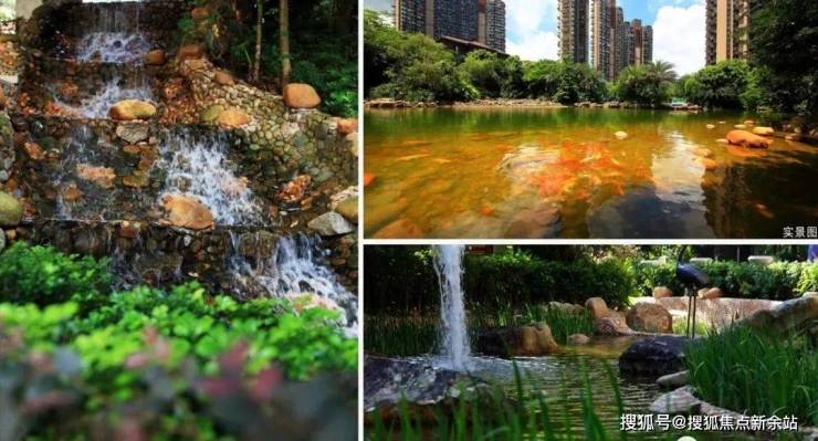 项目内部打造了一条沿着台地蜿蜒的溪流,该水系为市面罕见的活水溪流,贯穿整个社区园林,依据溪岸的曲直不同和地形变化,打造叠水、溪流、瀑布、水潭等多样特色水景,溪岸植物种类繁多,与水流互为风景,沿岸专门设置不同的亲水平台,营造自然灵动的栖心之境。
