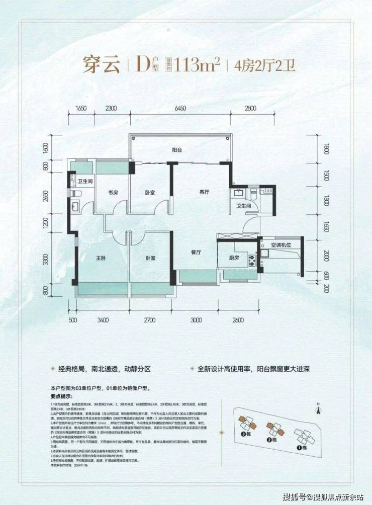 113㎡的4房2厅2卫,设计的是竖厅南北通透格局,进门入户玄关,客厅连接次卧出6.45米长的大阳台,四开间朝南,4个卧室分别做到了3.4米/2.7米/2.7米/2.3米的宽度,主卧大套房设计,U型厨房,公卫三段式分离设计,得房率约:81.39%(不含赠送),阳台主朝东北向,看科学公园景观。
